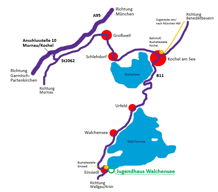 Anreise vom Hbf München mit dem Regionalzug nach Kochel am See. Vom Bahnhof Kochel fährt der Regionalbus Richtung Garmisch-Partenkirchen. Die Haltestelle Einsiedl befindet sich in ca. 50 Meter Entfernung gegenüber dem Jugendhaus Walchensee.